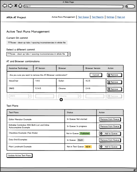 The Data Management page provides an overview of the latest test plan versions for common web components and their current status in the ARIA-AT Community Group’s review process. Admins can use this page to manage test plans in the test queue and monitor their progress through various phases.